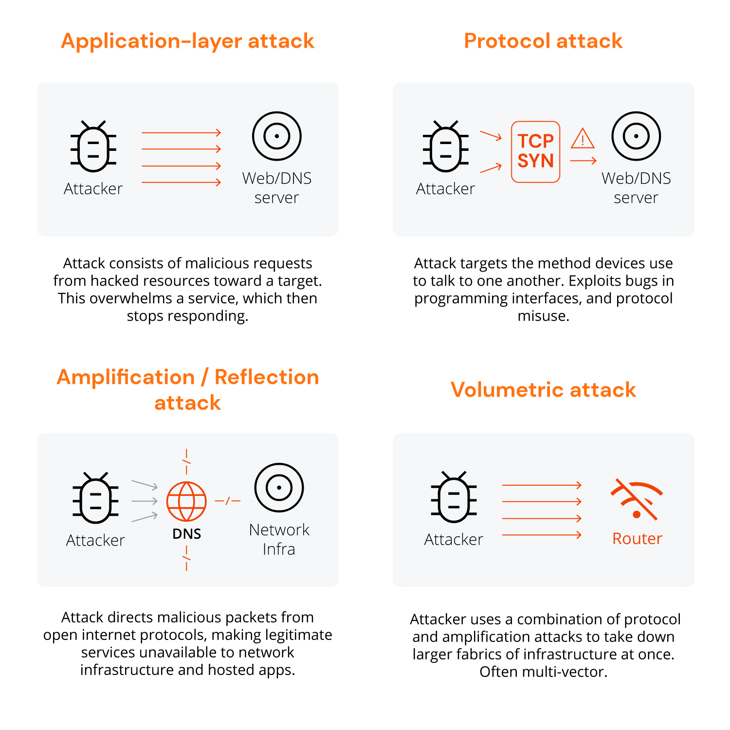 There are four main types of DDoS attacks. Most hackers do not stick to a single type, but try to overwhelm and attack as many systems as possible by combining the different types in what are known as multi-vector DDoS attacks.
